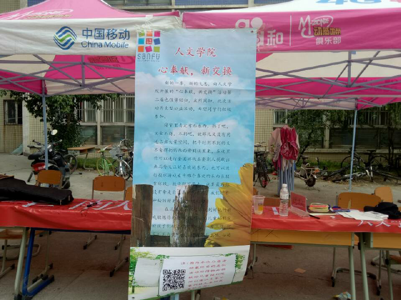 5月17日,球王会官网入口人文学院第二届“心奉献,新交换”活动于餐厅西广场正式拉开帷幕,活动通过公益性与娱乐性相结合的方式,来为福利院儿童募捐物品。