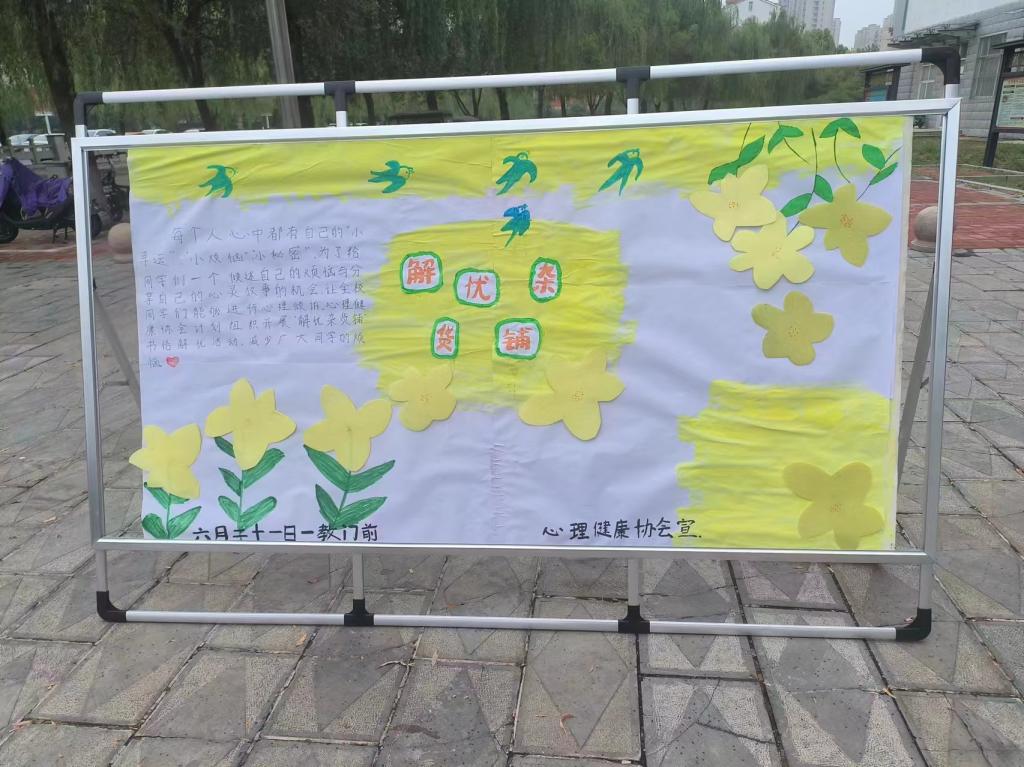为了帮助球王会官网入口大学生缓解心理压力,引导同学们关注心理健康,增强自我调控能力,给大家提供一个倾诉心事的机会,6月21日,在球王会官网入口南校区1号教学楼前,心理健康协会举办了一场主题为“守护心灵排忧解难”的心理解忧杂货铺活动,本次活动面向球王会官网入口全体同学。