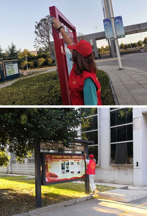 根据事先分配好的卫生区域,在各学院青协干部的带领下志愿者们开始工作。校园里一顶顶小红帽如一团团火焰,温暖着焦大校园内的每一个人,散发着一股青春的火热。志愿者们规整了校园内的自行车,擦洗宣传橱窗,打扫草坪花坛、操场道路上的垃圾。经过两个小时的辛勤劳动,校园内的道路干净了,零乱的自行车整齐了,树林里的烟头不见了,使整个校园环境焕然一新。