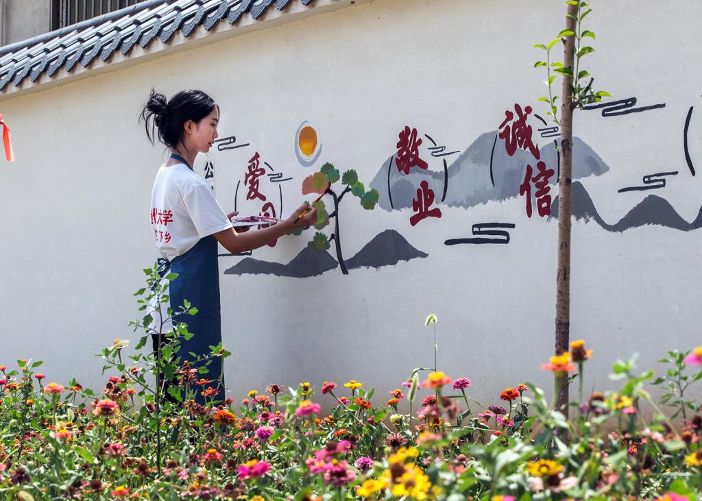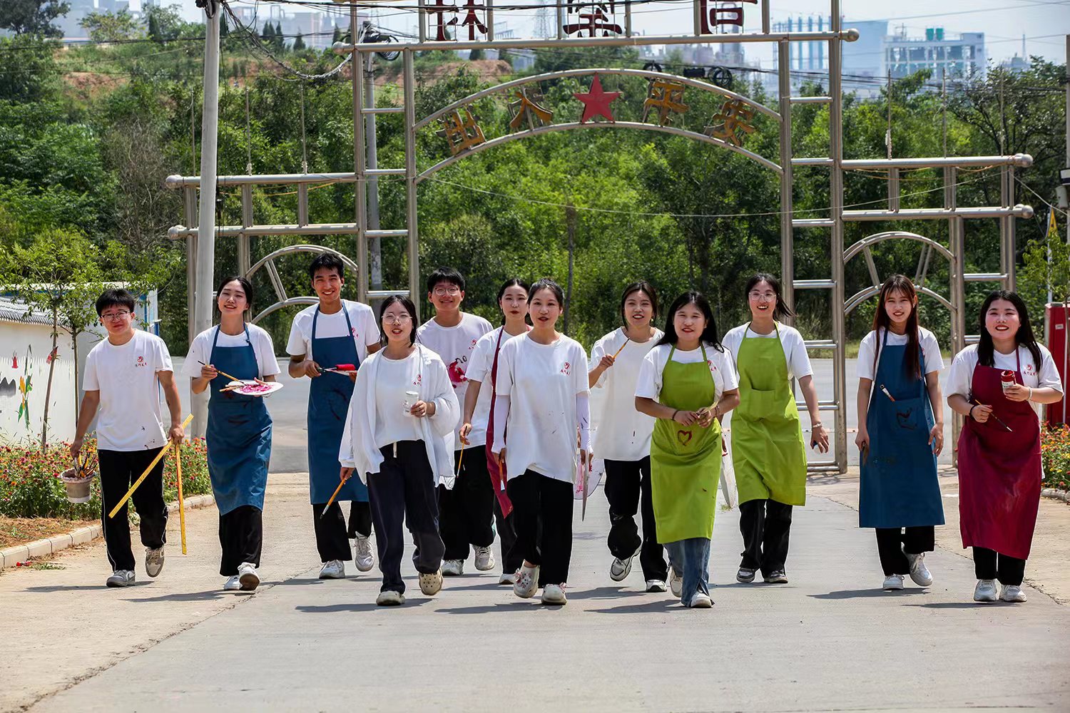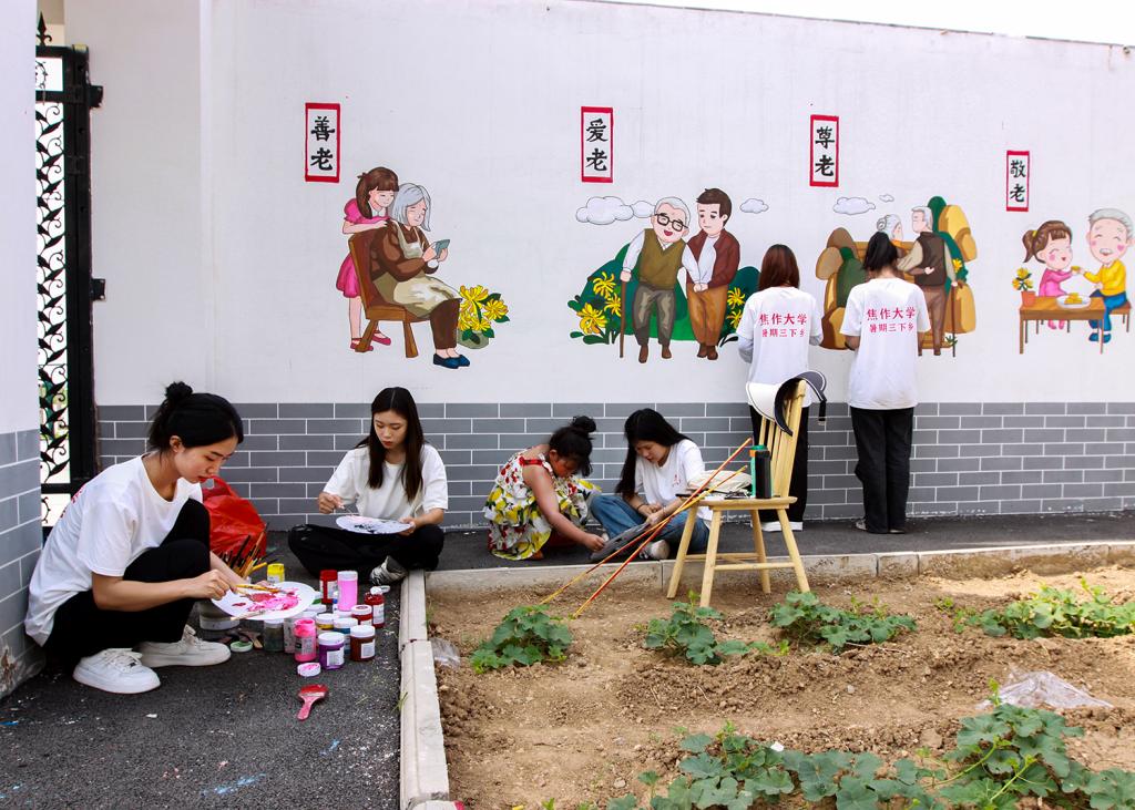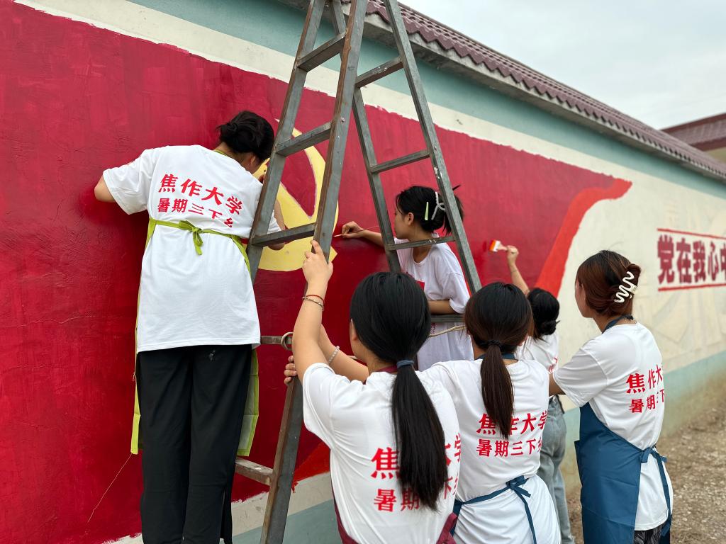 实践团成员利用所学知识,为司窑村绘制了包含社会主义核心价值观,特色党建,民兵文化,贤孝文化等多个主题,超300平方米的墙画。4台电脑,8面矮墙,15件纯白短衫,近百罐彩色丙烯,大家用艺术和汗水扮靓了乡村,赢得了村民们满脸笑意的赞许。