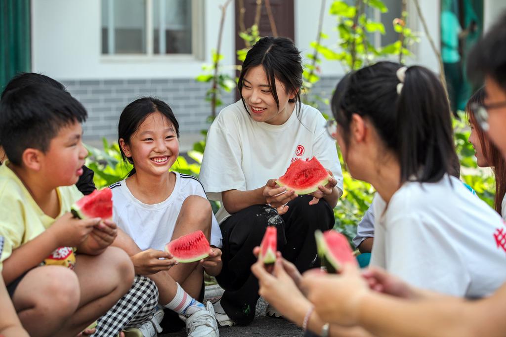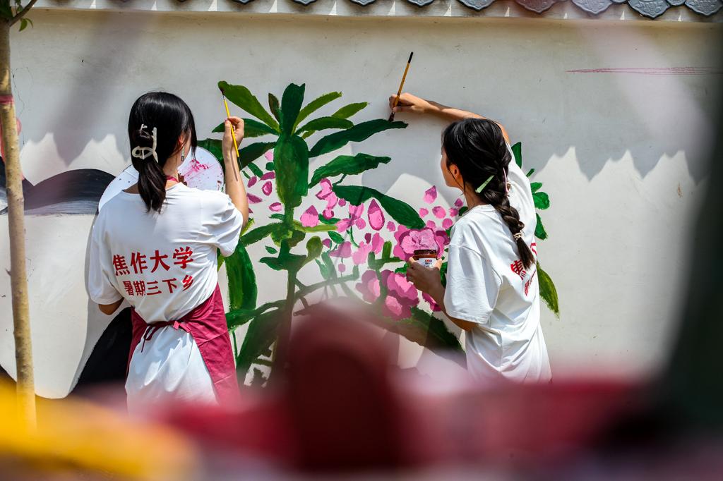 7月上旬的八阁山脚,是河南超过40度高温的区域之一,然而烈日酷暑,阻挡不了同学们丈量青春的脚步。为避开烈日灼晒,他们赶在黎明日出前开工;为保证工作时间,他们共沐深夜漫天星辰;为尽力多做贡献,他们利用无法户外作业的时间为留守儿童开展美术辅导和生活陪伴。他们见过凌晨5点钟的八阁山村落,也曾在深夜1点的漫天星辰下挥舞画笔。