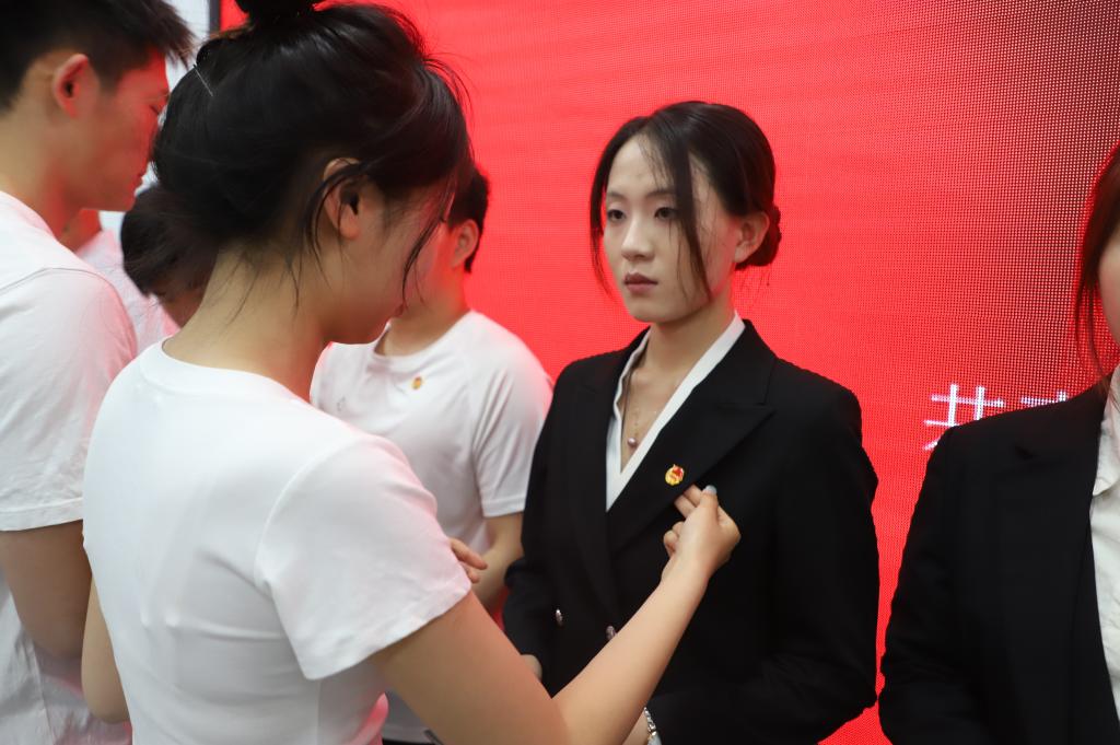 在庄重的乐曲声中,各学院团总支副书记迈着稳健的步伐走向新团员代表。他们郑重地为新团员佩戴上闪耀的团徽,将崭新的团员证交到新团员手中。这一刻,金色的团徽在胸前熠熠生辉,绿色的团员证在手中闪耀,标志着这些青年学子正式肩负起共青团员的光荣使命,成为中国共产主义青年团这个先进青年组织的新生力量。会场响起热烈的掌声,见证着这庄严而神圣的时刻。