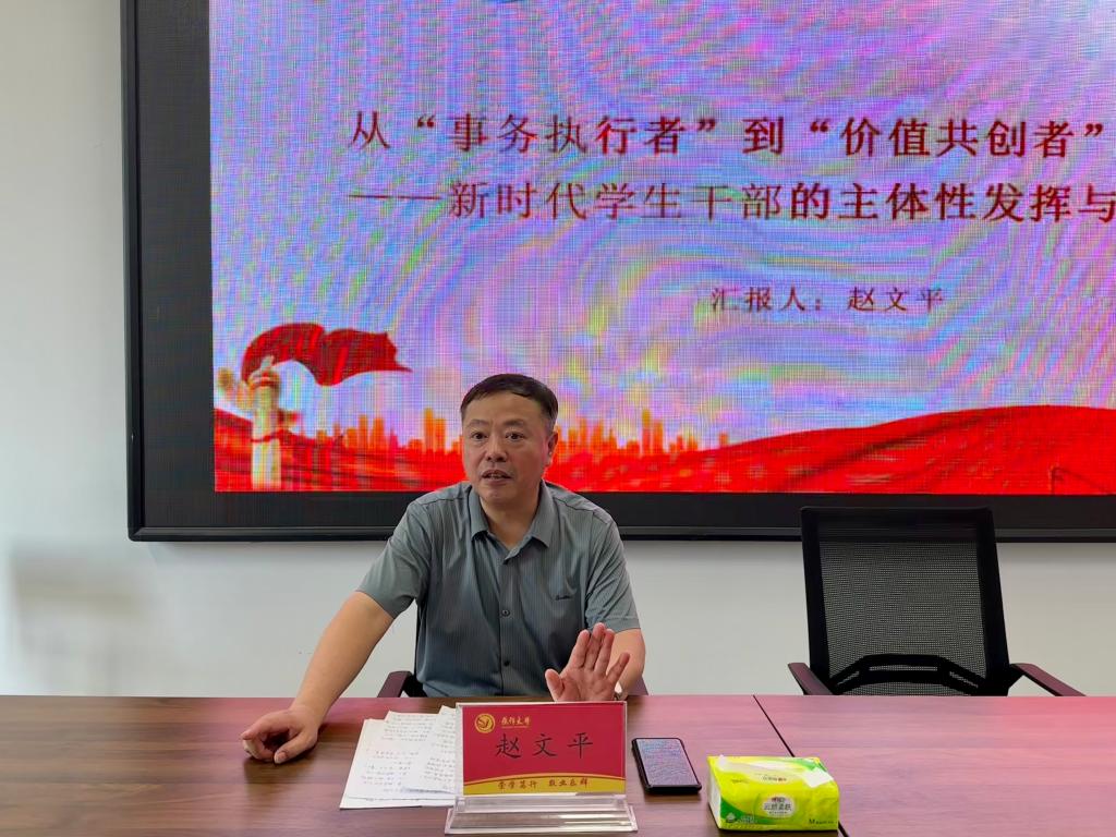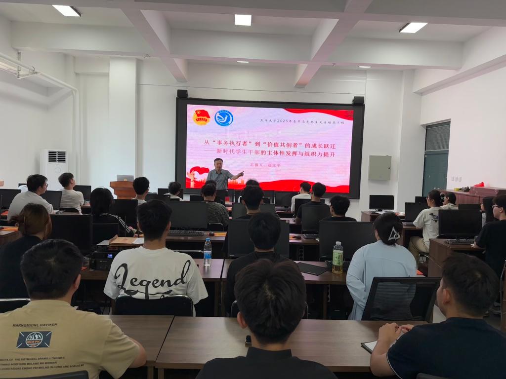 赵文平以“从‘事务执行者’到‘价值共创者’的成长跃迁:新时代学生干部的主体性发挥与组织力提升”为题,围绕新时代青年学生的责任使命,从思想站位、工作能力、现实问题三个维度,深刻剖析了新时代学生干部的核心使命与成长路径,生动讲解了如何做好一名优秀的学生干部。他指出,学生干部要“以信仰为灯,以服务为舟”,在思想上,要始终与党中央保持高度一致,主动学习政治理论,做党的声音的传播者、青年思想的引导者;在行动上,要摒弃“官本位”思维,破除“被动执行”的惯性,以“躬身入局”的姿态深入同学、服务同学,用智慧和热情点燃团队的创造力。他特别强调,学生干部不是“权力的搬运工”,而是“责任的践行者”,要以“功成不必在我”的境界和“功成必定有我”的担当,在服务中实现青春价值的升华。